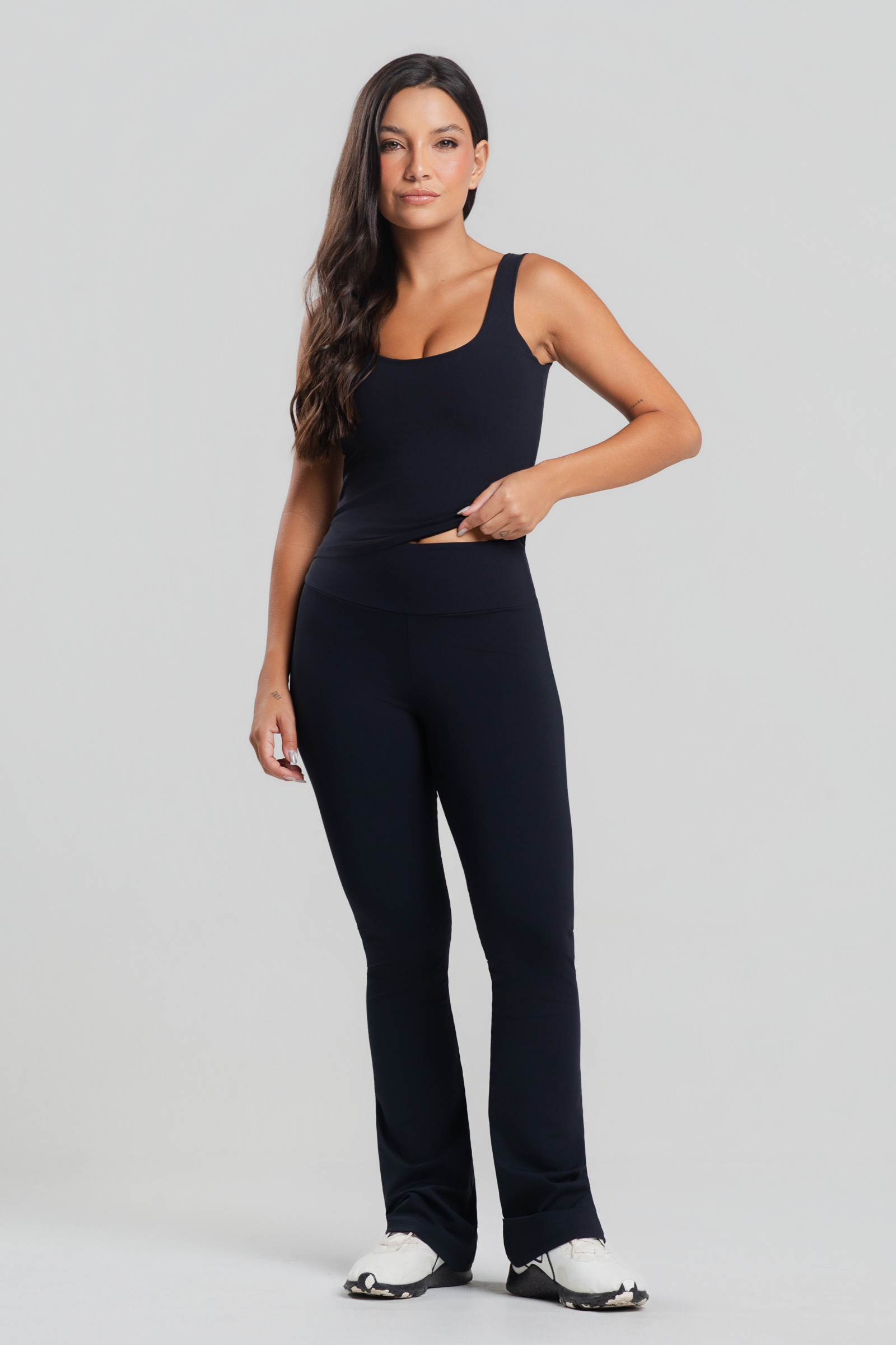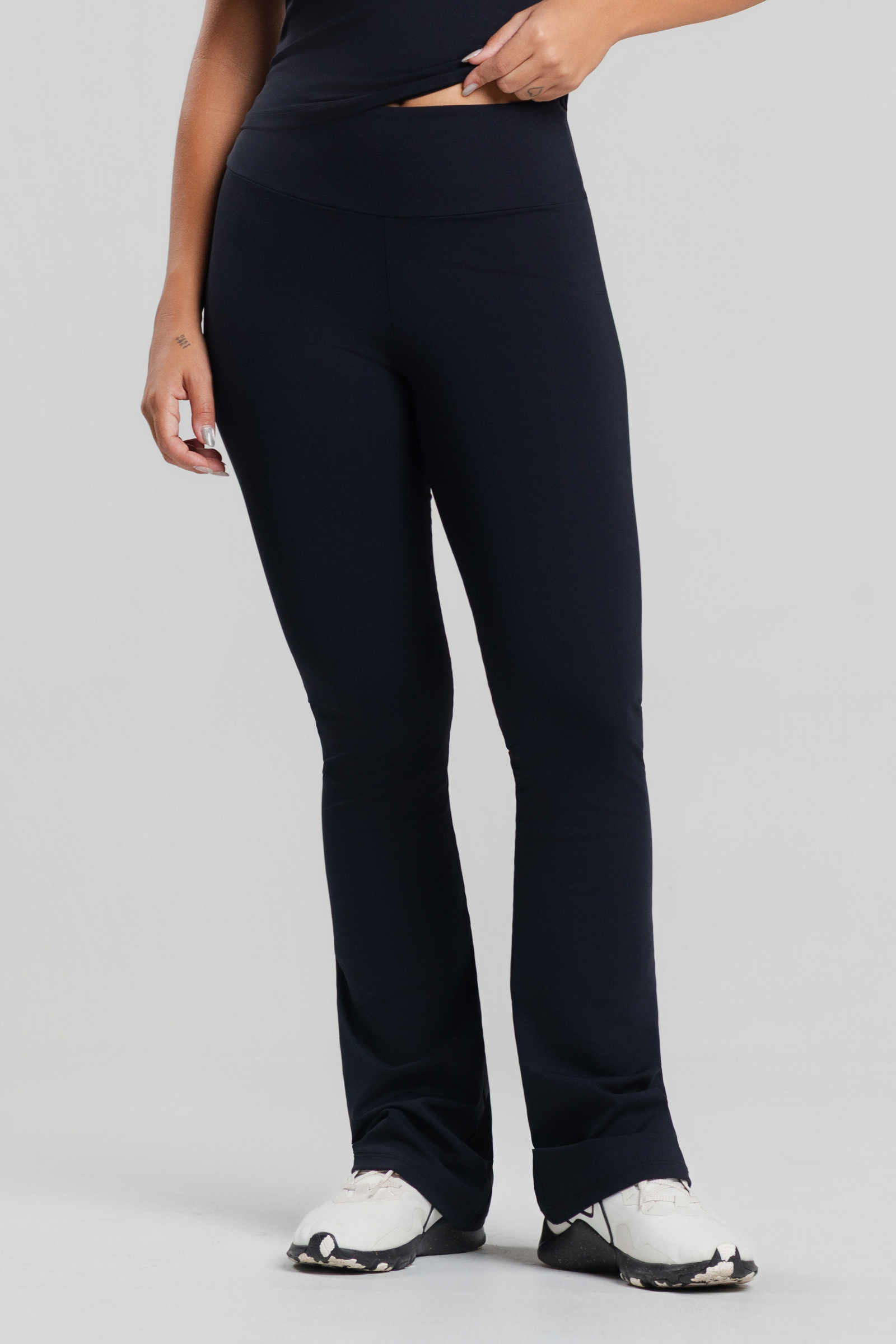 A Flare Aura foi criada para realçar a silhueta com sofisticação. Com modelagem ajustada até o joelho e abertura suave na barra, ela alonga visualmente as pernas e cria um caimento impecável no corpo.