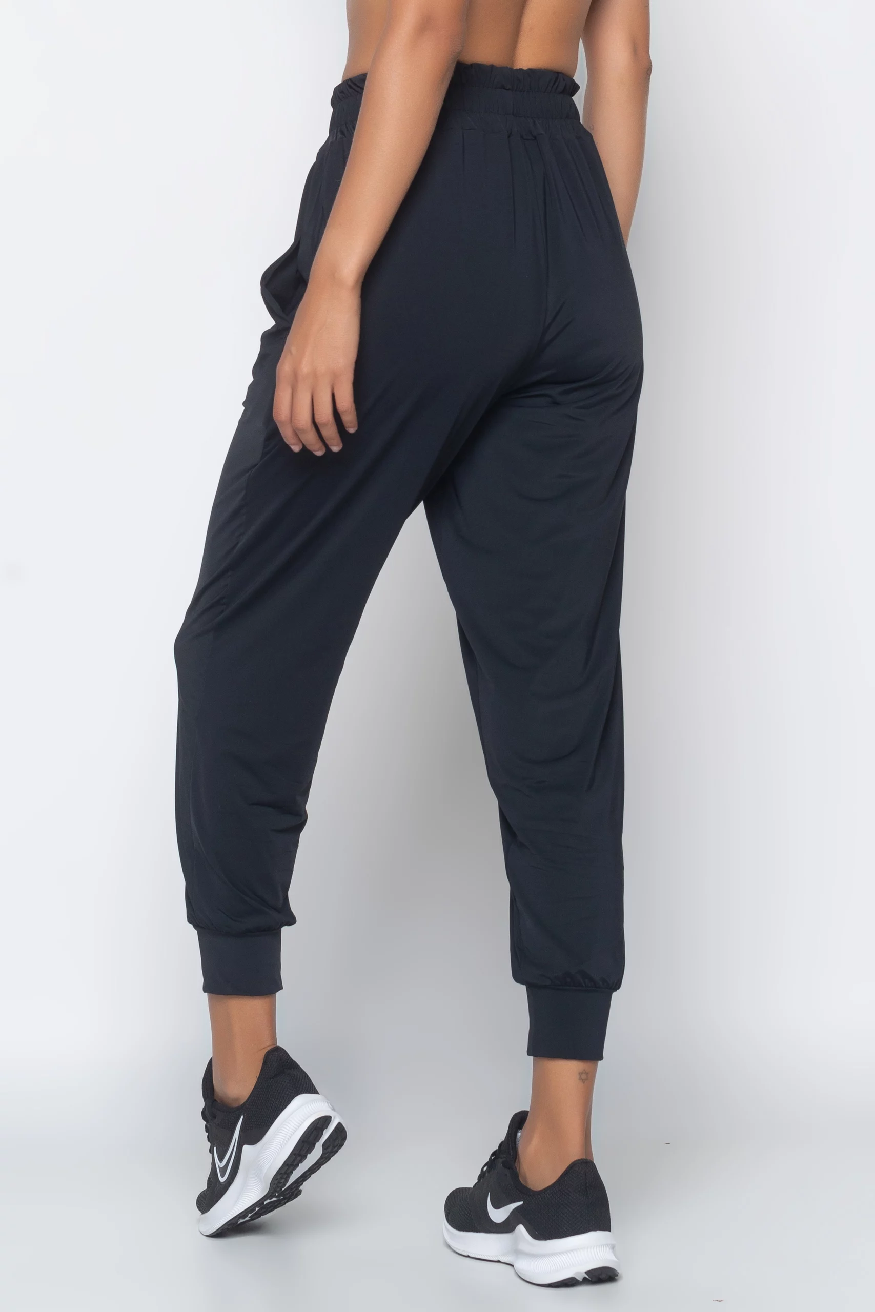 - Elástico no cós, para melhor ajuste à cintura