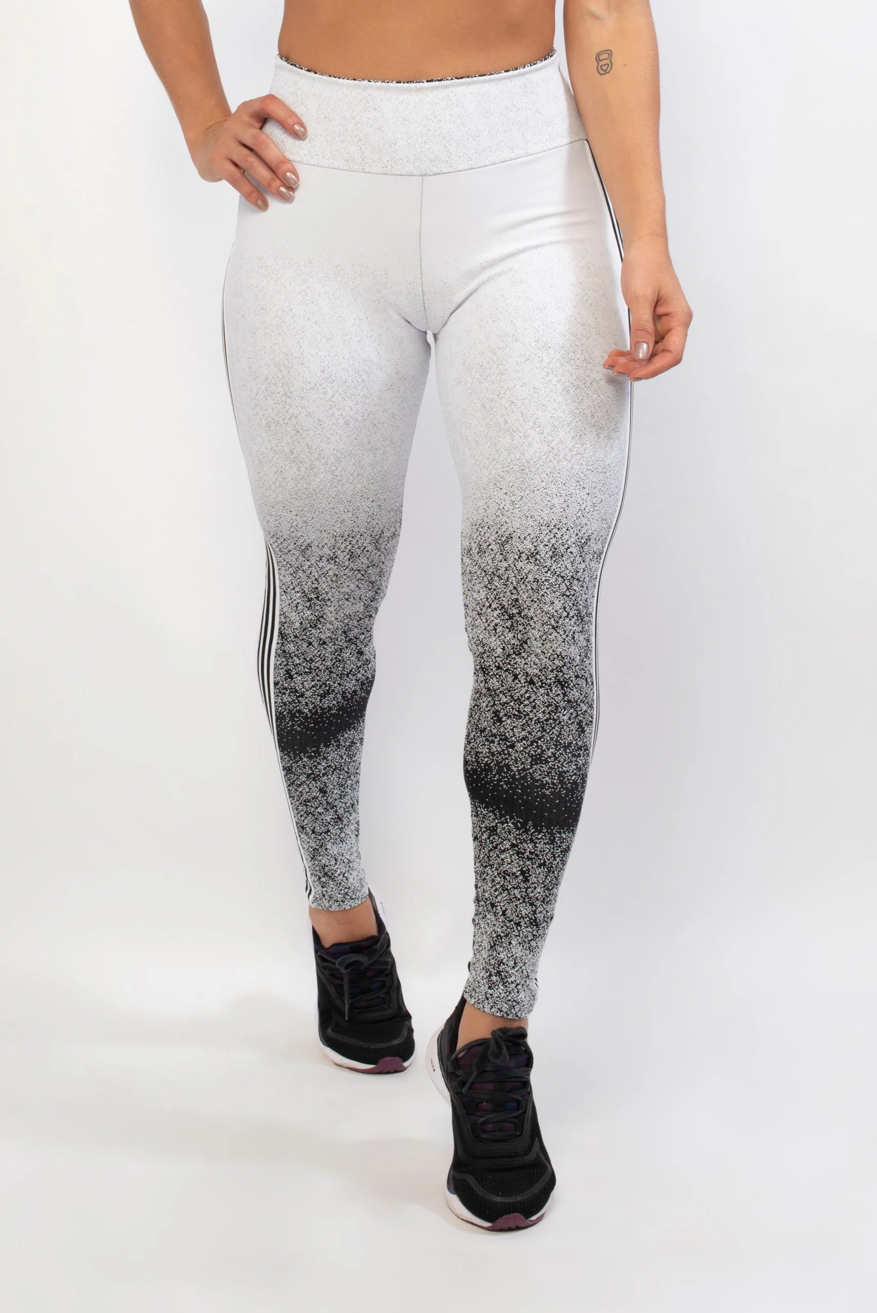 Legging Touch tem um toque muito macio além de visual lindo e moderno, com listras laterais preto e branca, super tendência. Tecido jacquard que já é queridinho, além disso os fios que o tecem são tratados com dióxido de titânio, o que confere proteção vitalícia contra raios solares e propicia proteção solar com fator FPU50+