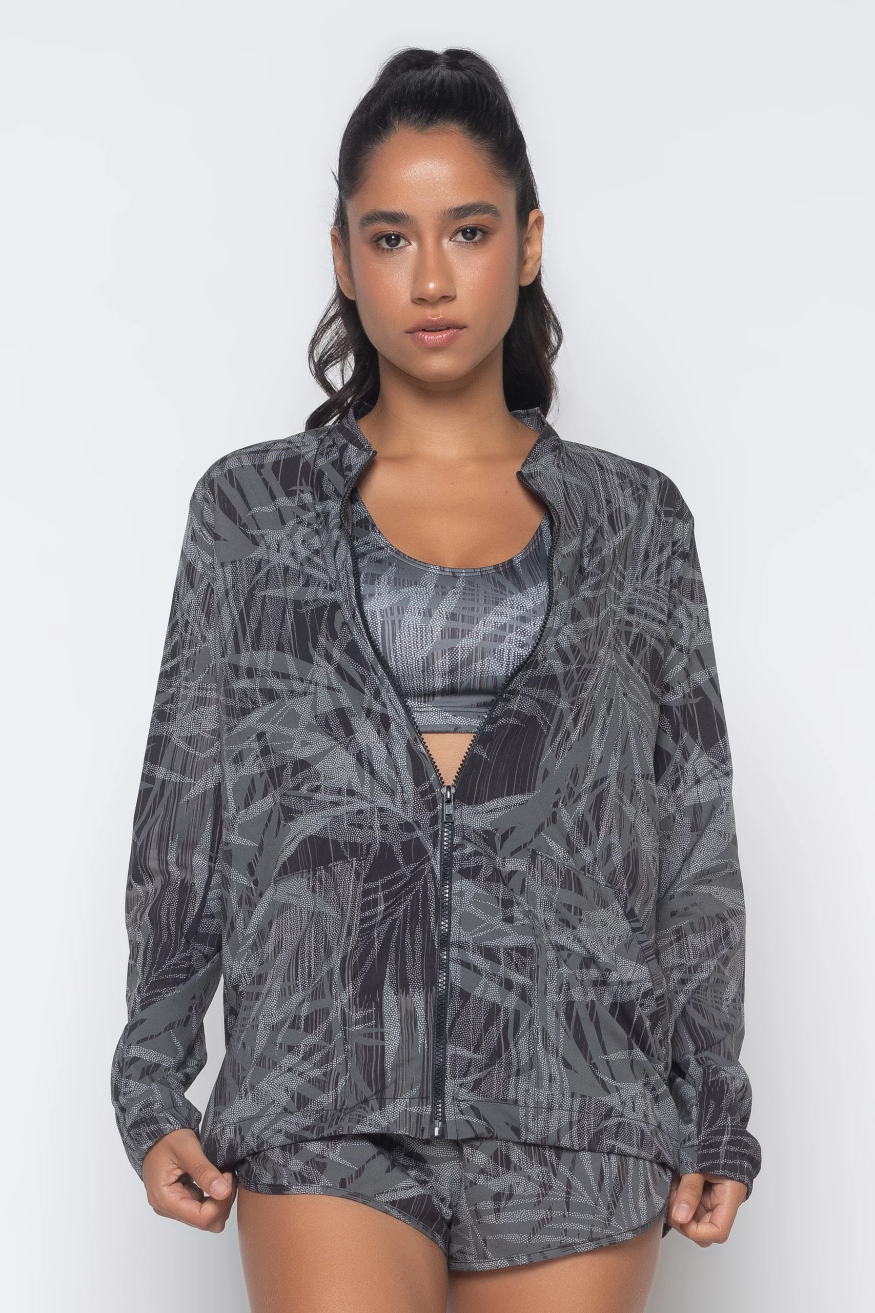 Casaco Havana de manga longa, fecho de zíper na frente e com bolsos.