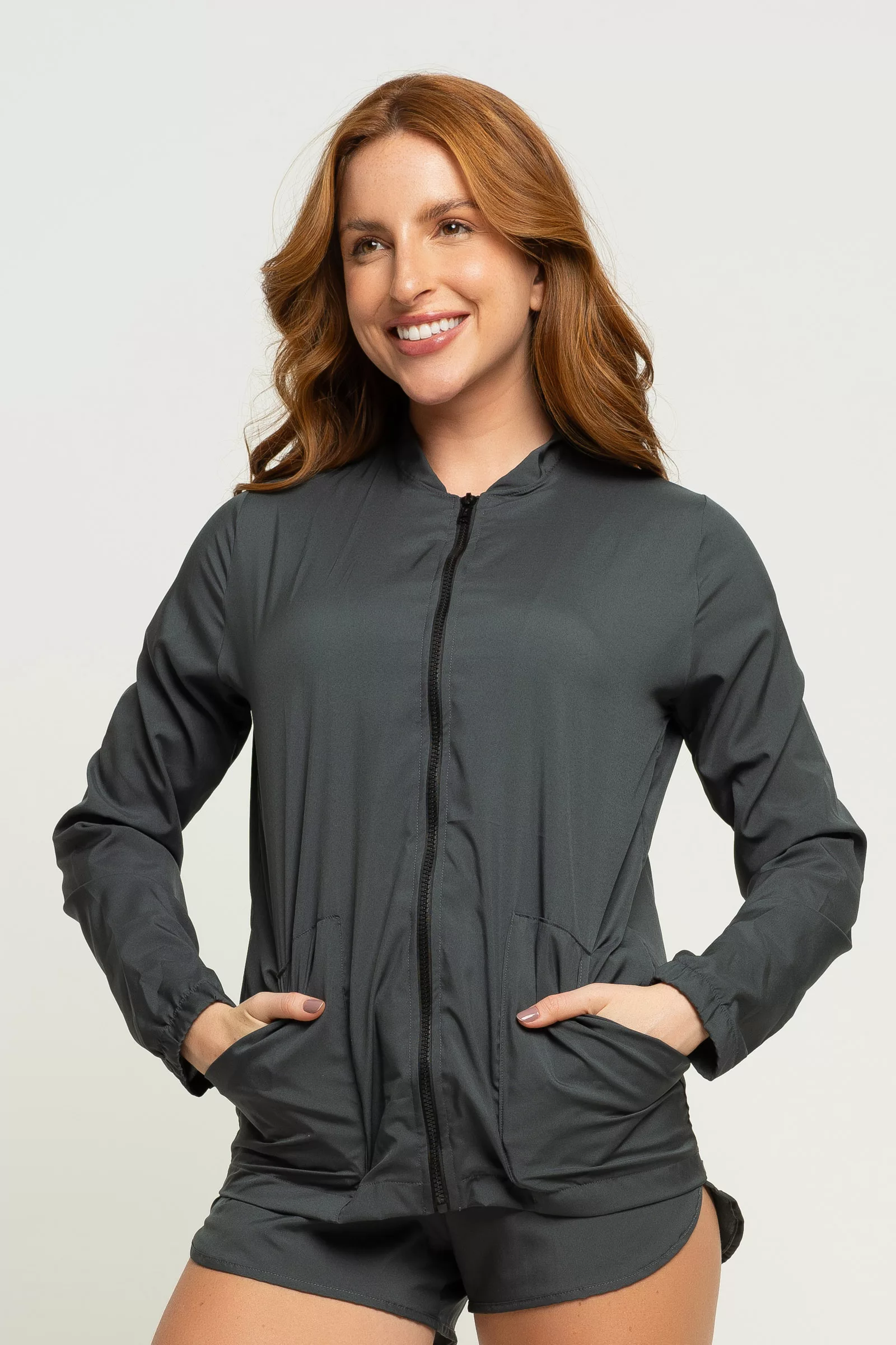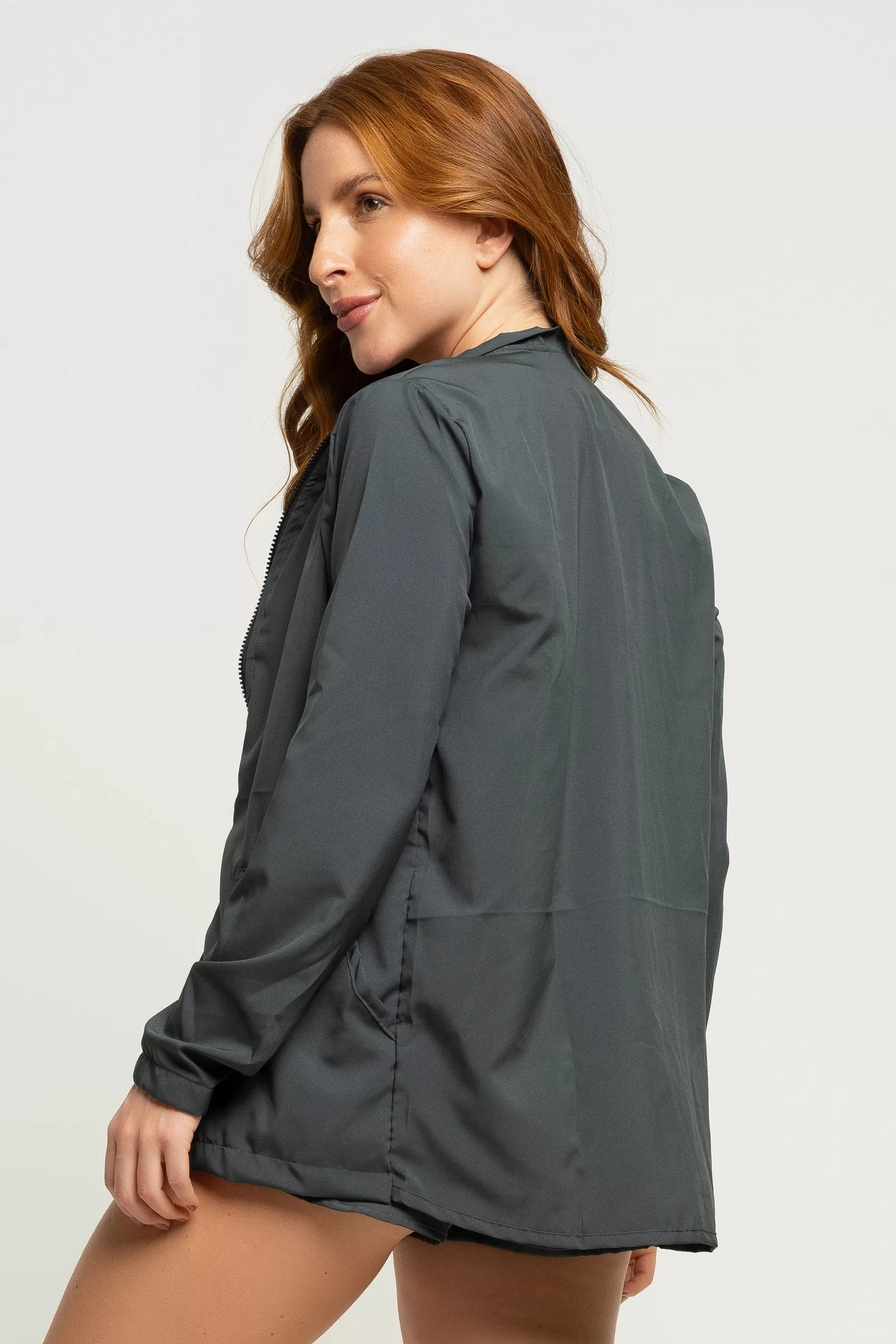 Casaco Havana Liso de manga longa, fecho de zíper na frente e com bolsos.