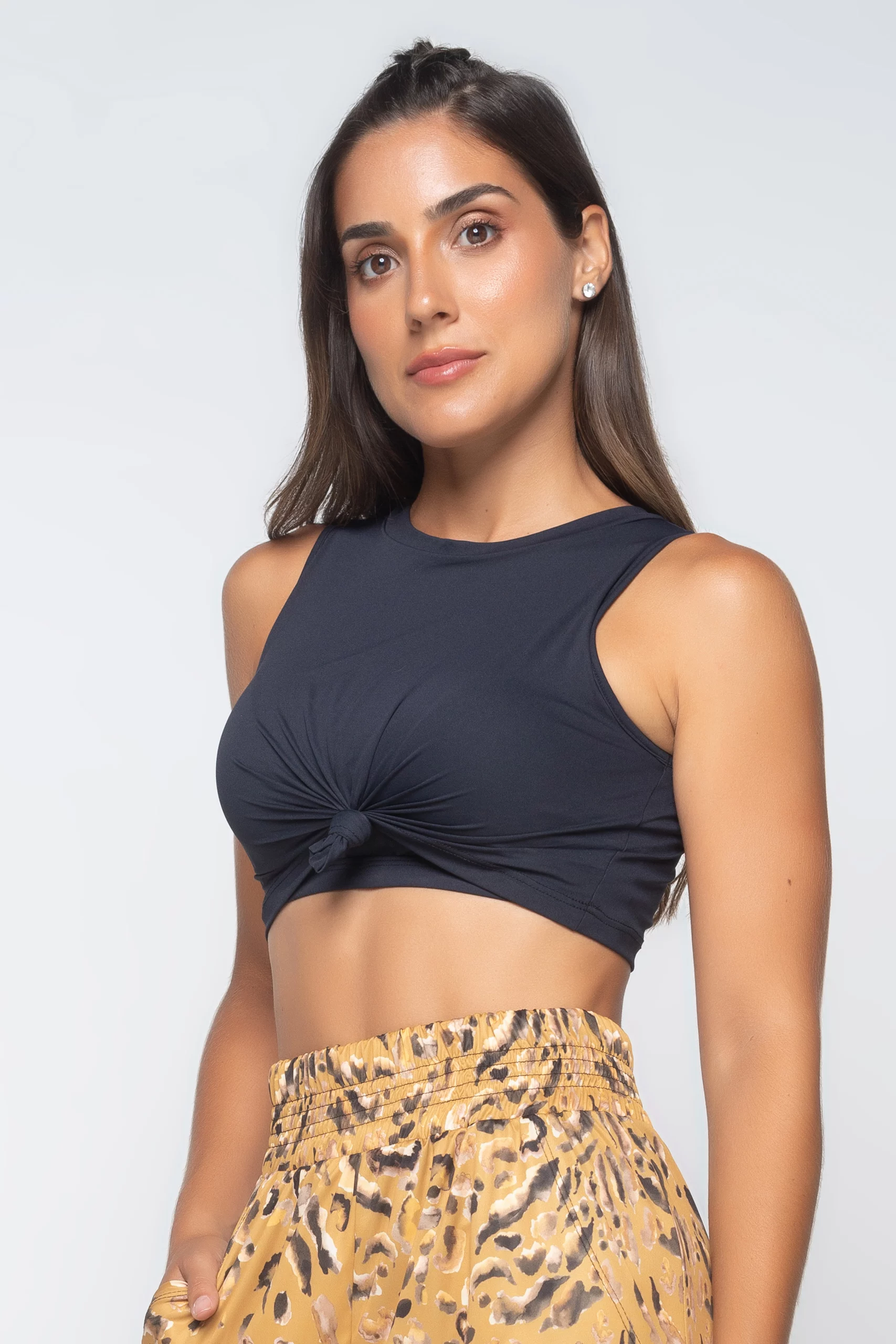 Top cropped com nó frontal é uma peça dupla. Na parte interna possui um top em tela elástico e bojo removível. O charme final é garantido pelo Cropped externo e sua modelagem solta que proporciona a amarração do nó.