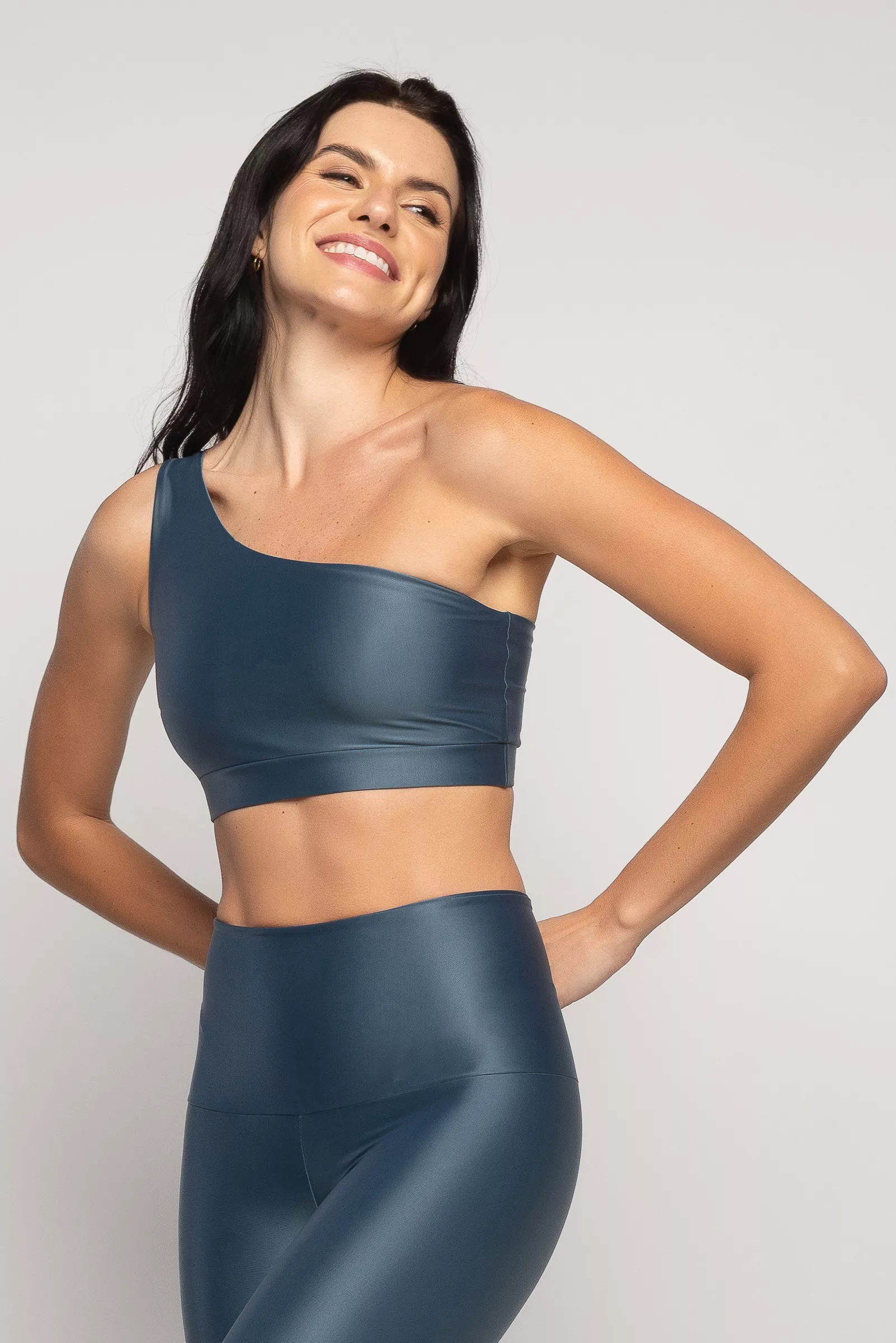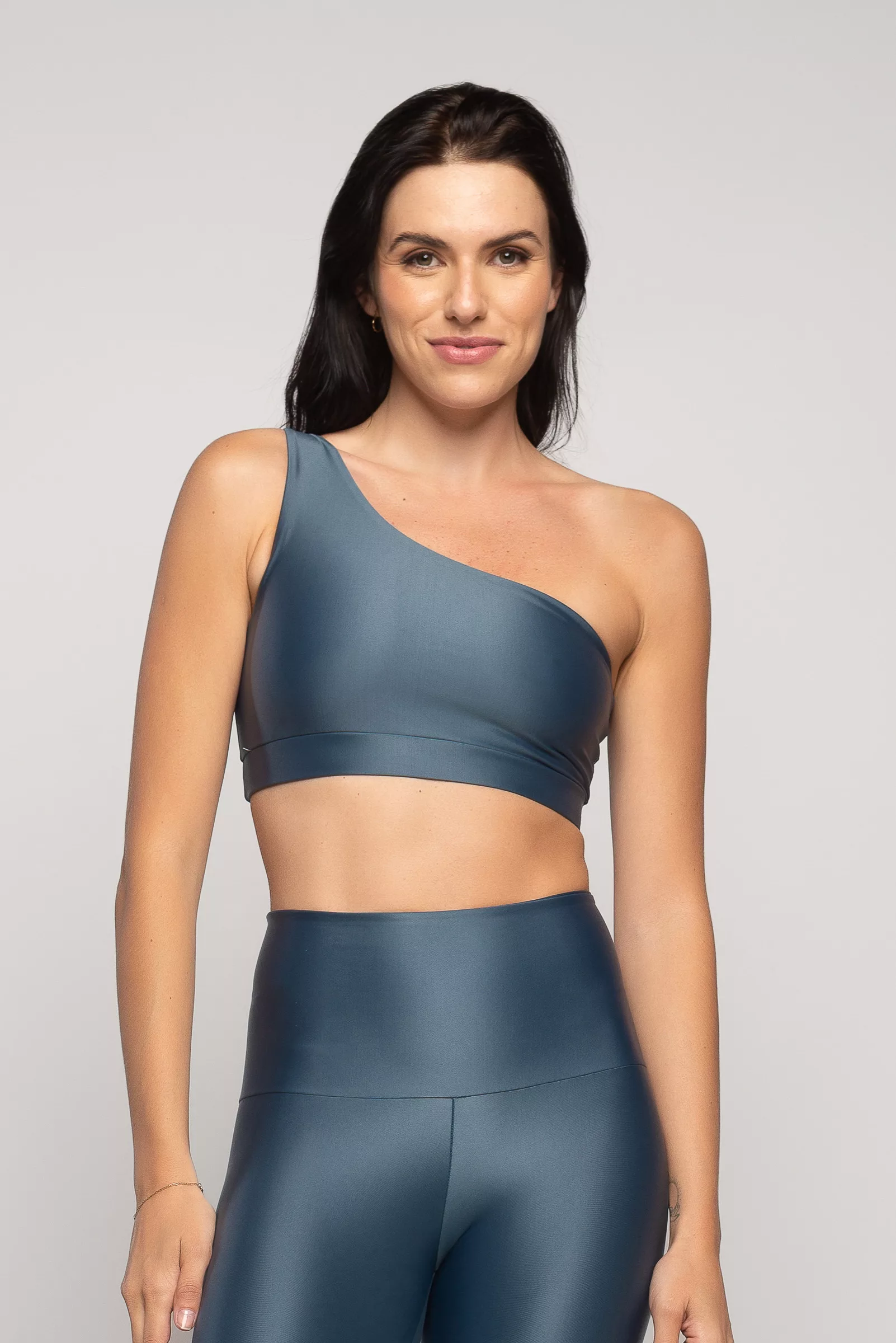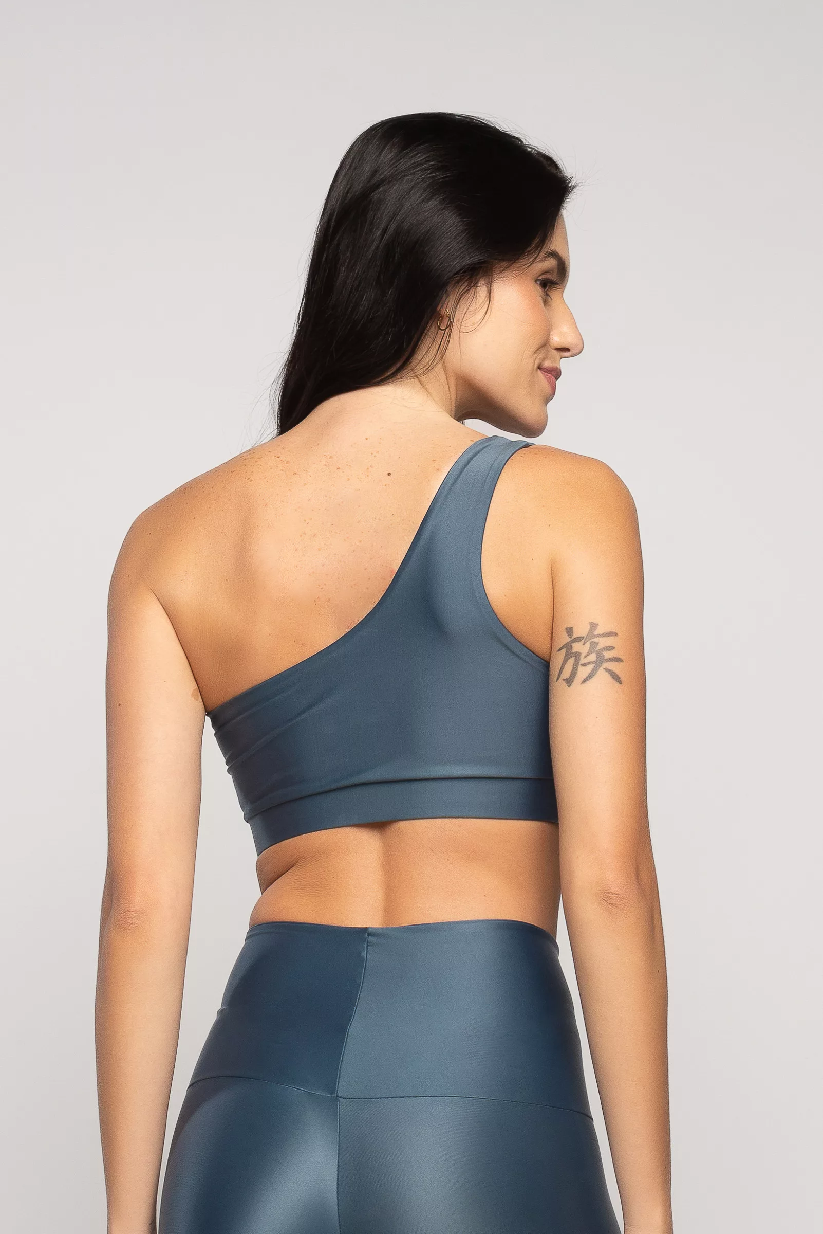 Top em modelagem mais longa estilo Cropped desenvolvido em tecido de alta performance com brilho perolizado, com um ombro só valorizando o colo e pescoço. Possui forro Premium de Poliamida em todo seu interior e costuras embutidas.