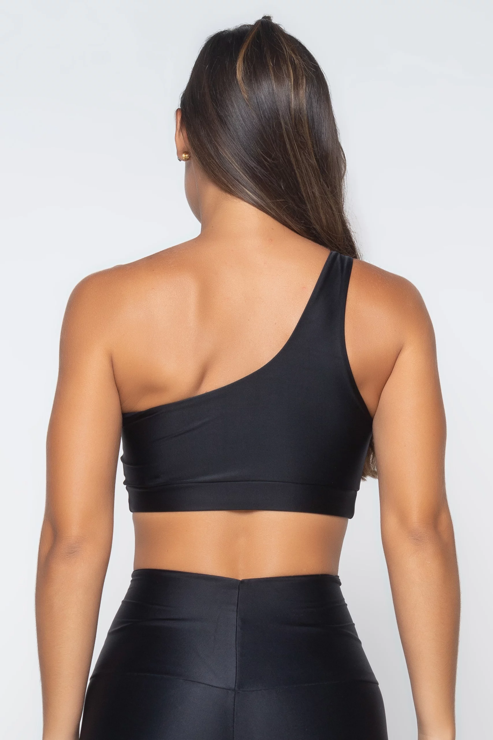 Top em modelagem mais longa estilo Cropped desenvolvido em tecido de alta performance com brilho perolizado, com um ombro só valorizando o colo e pescoço. Possui forro Premium de Poliamida em todo seu interior e costuras embutidas.
