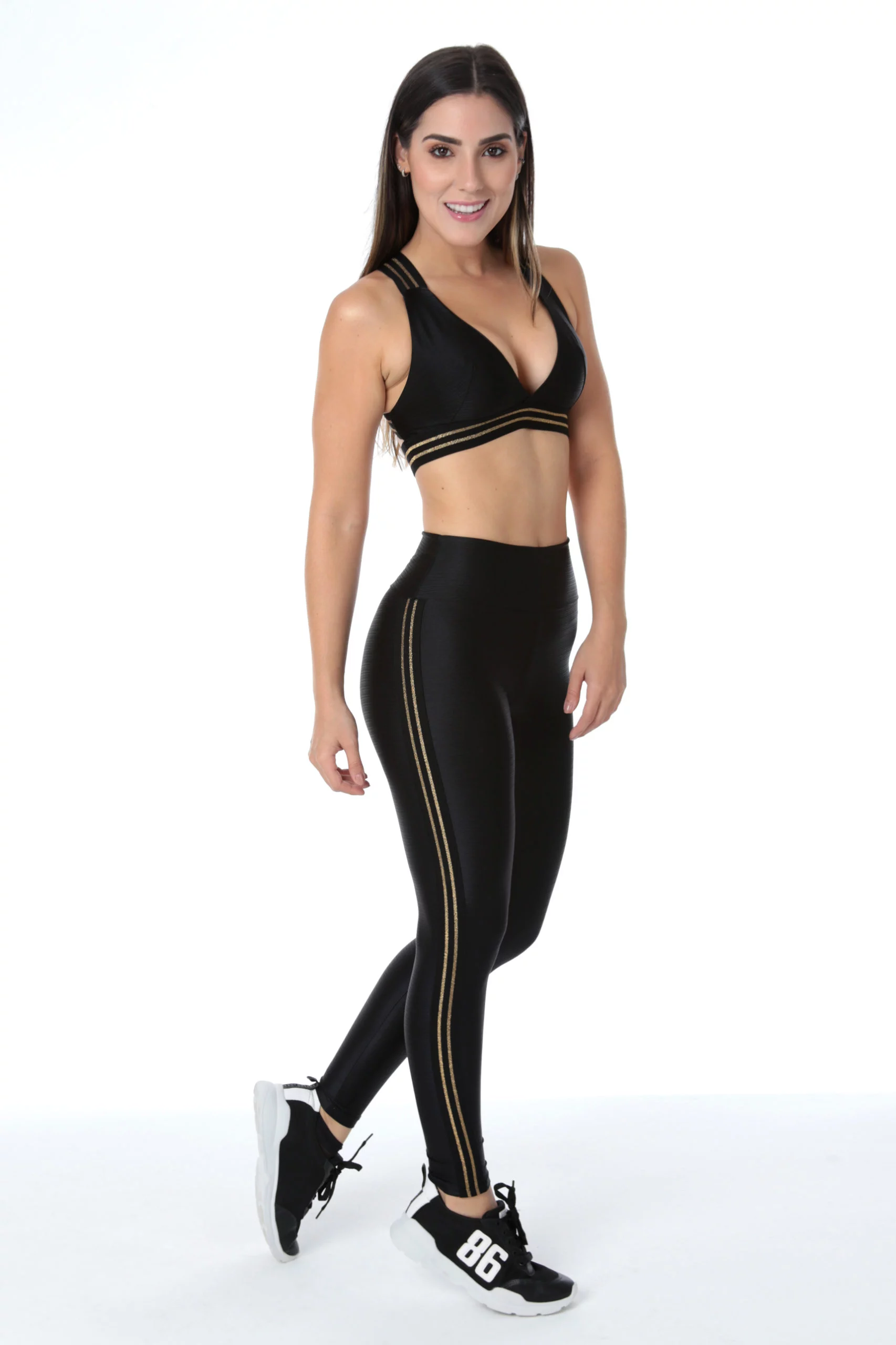 A legging Gold é produzida em tecido com brilho que remete ao da seda. Tem listras laterais coloridas em fio de lurex dourado, super chique. Deixa o pretinho básico de lado e já garante a sua. É de tirar o fôlego!