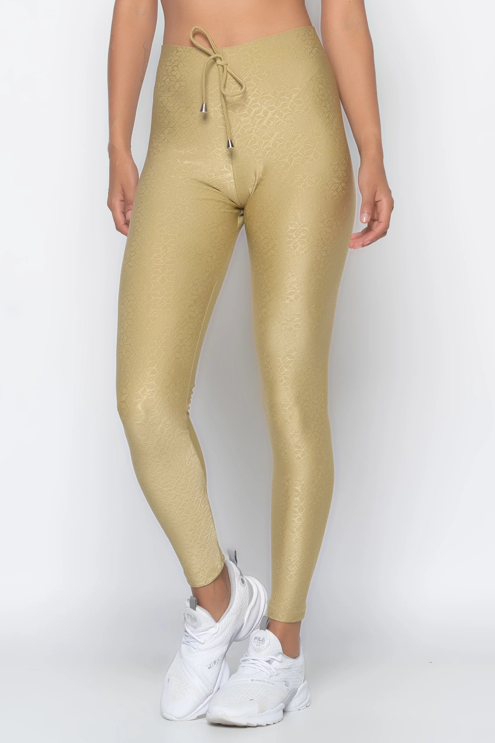 Calça produzida em tecido de ketten jacquard com um alto percentual de elastano, com a principal característica de remodelar a silhueta. O desenho cria um relevo brilhante, equilibrando desempenho nas atividades e lindo efeito estético. Além disso leva um elástico embutido na cintura, para ficar uma peça continua, e pra finalizar o cadarço que confere o charme final.