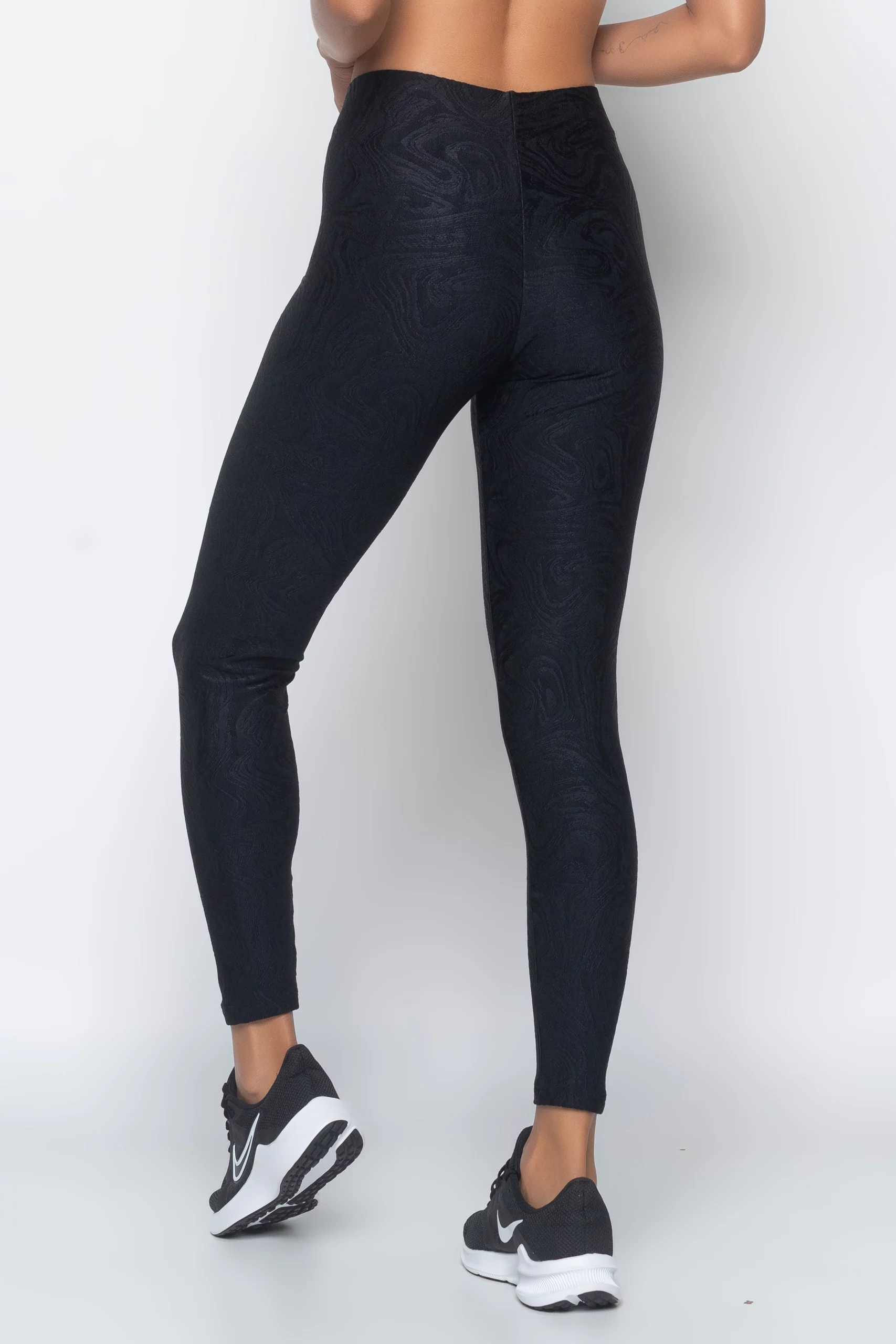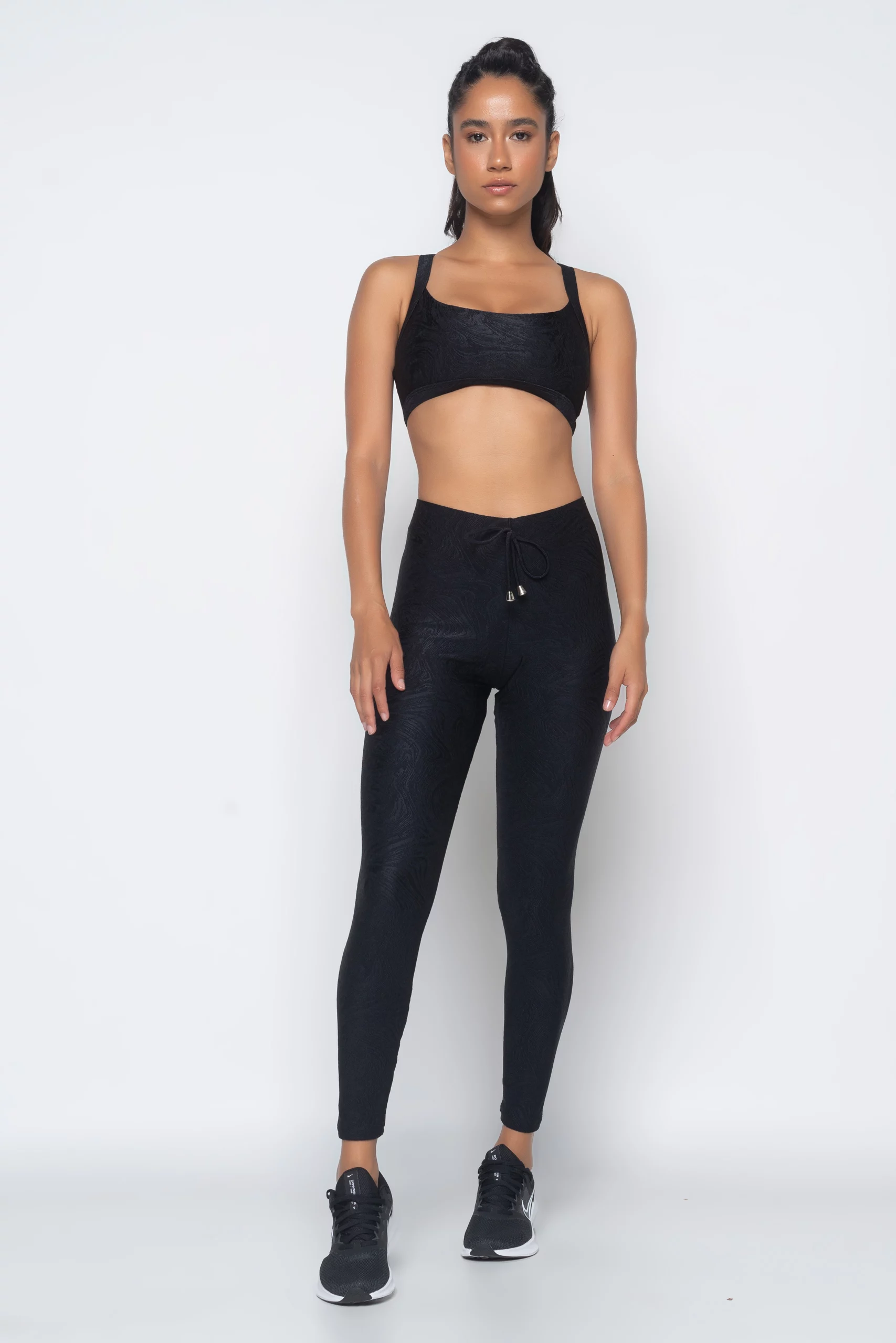 Calça produzida em tecido de ketten jacquard com um alto percentual de elastano, com a principal característica de remodelar a silhueta. O desenho cria um relevo brilhante, equilibrando desempenho nas atividades e lindo efeito estético. Além disso leva um elástico embutido na cintura, para ficar uma peça continua, e pra finalizar o cadarço que confere o charme final.