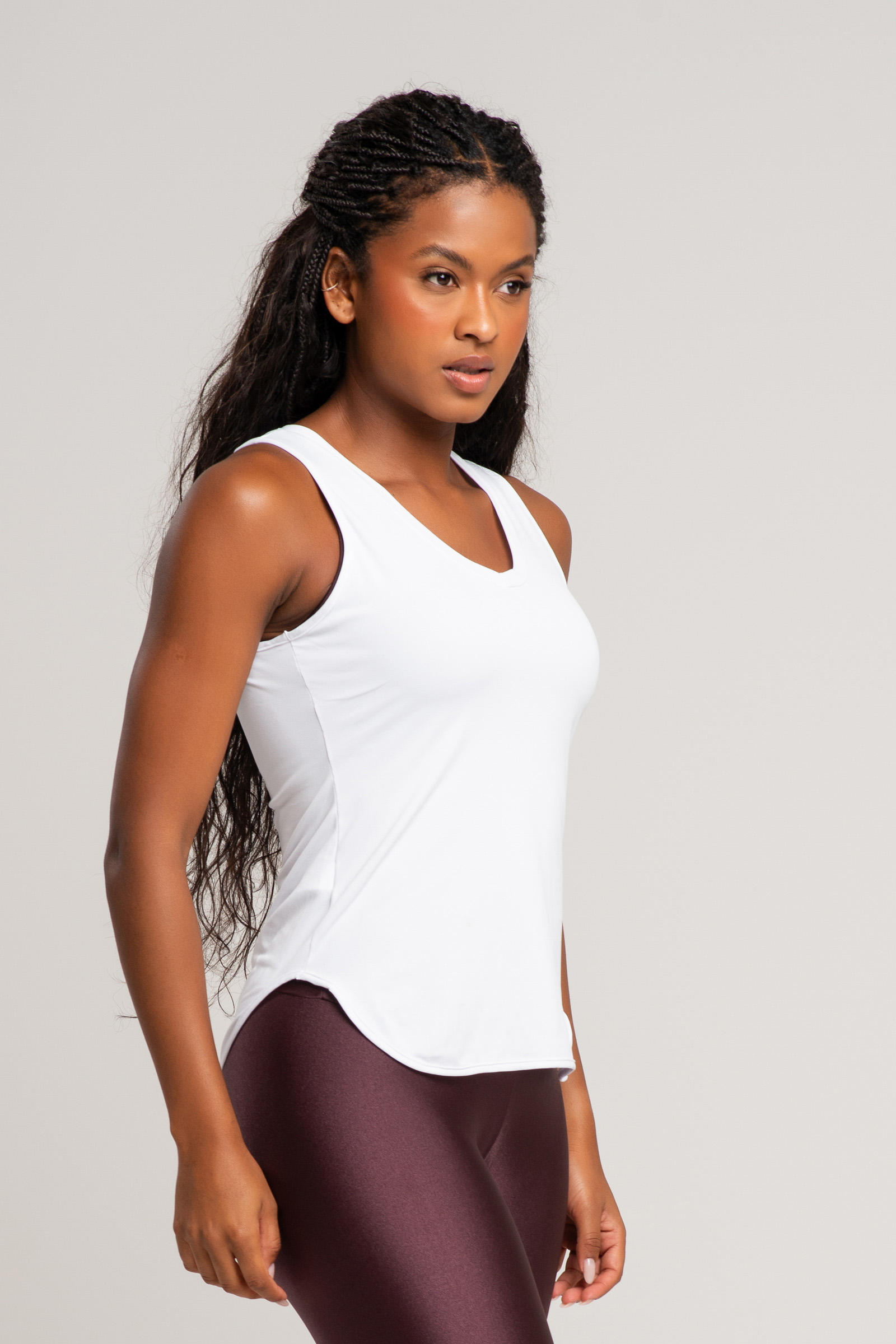 Uma peça que une feminilidade e alta performance. Com modelagem alongada, gola V e decote nadador, proporciona liberdade para movimentos dos braços. Seu design minimalista, com um discreto detalhe em termocolante transparente nas costas, é perfeito para criar combinações variadas. Feita em tecido leve e confortável, possui tecnologia “Easy Care”, que facilita a manutenção, oferece secagem rápida, evita formação de bolinhas e ainda conta com proteção UV.